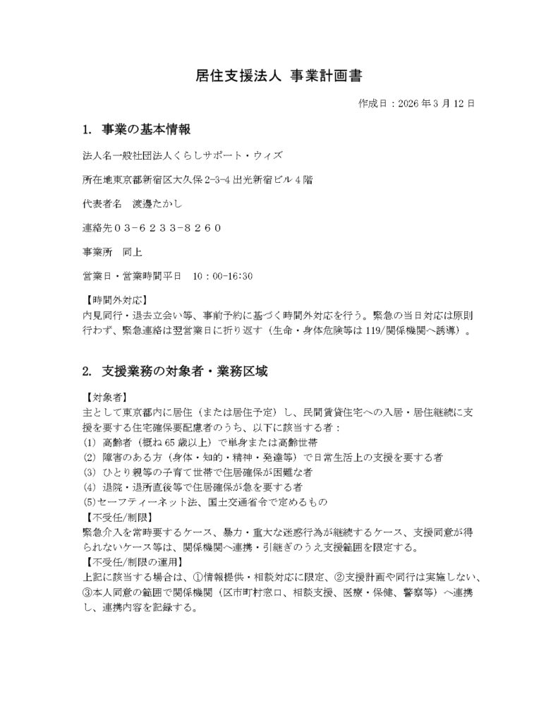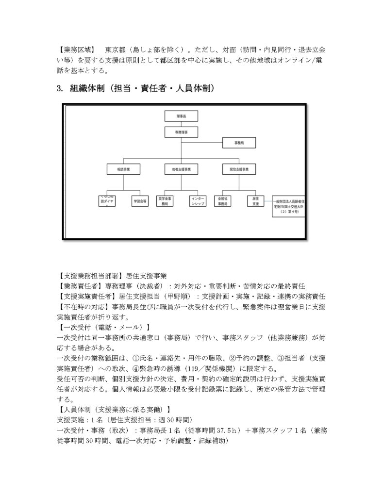 電話番号 : 03-6233-8260 ※メールでのご相談はメールフォームをご利用ください - 居住支援事業(相談及び支援業務)は、以下の補助金を活用(予定)して実施しております。活用補助金: 令和7年度居住支援協議会等活動支援事業。報告書を監督省庁国土交通省(事務局:居住支援サポートセンター)へ提出しています。相談者様・利用者様の個人情報を含む資料を提出する場合がございます。つきましては、上記の旨、予めご理解とご協力をお願い申し上げます。